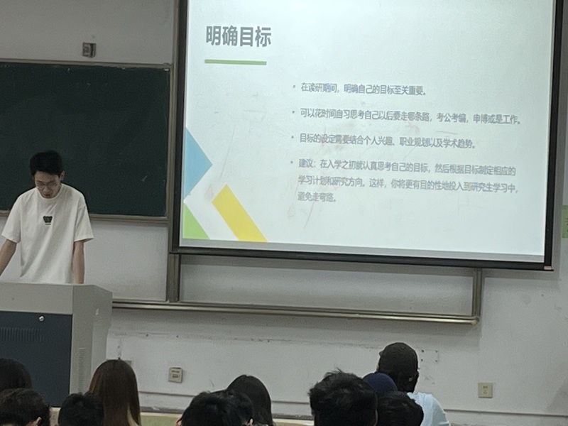 77779193永利官网2021级研究生吴婷、花锐东、叶沛林分别讲述了自身的学习经历。吴婷从学术论文、学科竞赛、硕士考试、博士申请流程进行了分享,建议大家多阅读顶会顶刊,尽早掌握本专业基本软件,了解自己的研究方向;花锐东从升学流程及时间规划、联系导师、科研计划、综合考核四个部分进行了经验分享,重点强调了明确自身节奏目标的重要性;叶沛林就升学要求方面作重点介绍,提出要认真研读目标院校的招生简章和招生目录,并用表格总结相应高校的申请条件,鼓励同学们要勇于尝试。